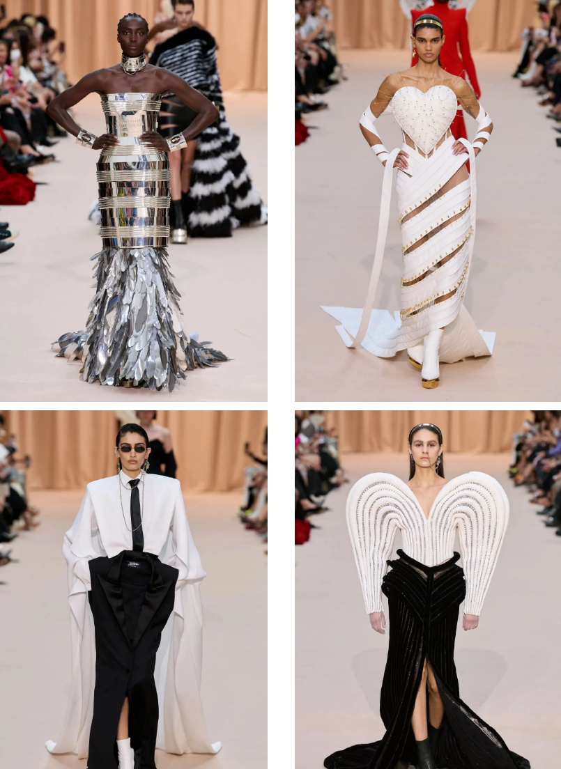 作为客座设计师,Olivier Rousteing将个人色彩融入品牌主旋律,大胆地描绘这这场属于时装的奇思妙想。本季以男装开场,非洲部落风的纹身衣、穿孔鼻环等跨文化元素突破审美极限,致敬Jean Paul Gaultier 1994年的春季成衣系列,而紧身锥形胸衣 、缠绕的绷带、厚底鞋等造型设计,则让刚柔并济的美学风格于此交汇,成为个性张扬的代名词。