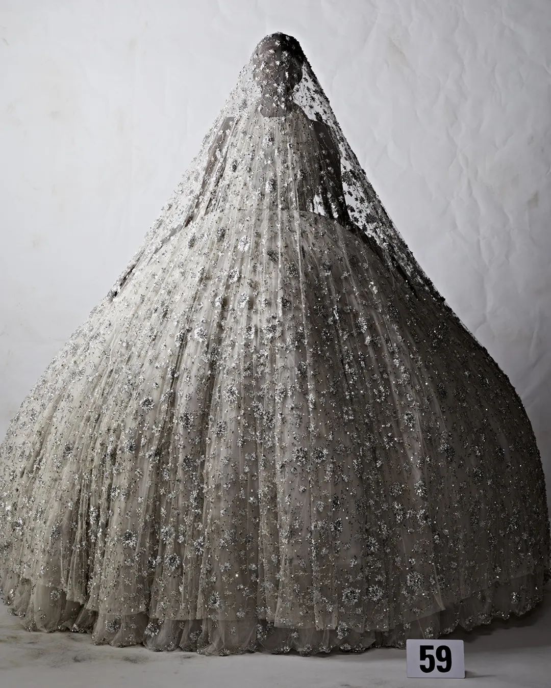 压轴的婚纱由250米长的不同材质薄纱缝制而成,致敬典藏花纹样式,其刺绣工艺耗时 7,500 小时,使用25种类型的闪光珠片及串珠,包括 70,000颗水晶、80,000片银叶及200,000个亮片。将传统工艺融入科技创新,无论面料还是设计概念,都为高定时装之于时代拓展了新的思路。