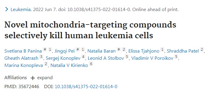 Panina, S.B., Pei, J., Baran, N. et al. Novel mitochondria-targeting compounds selectively kill human leukemia cells. Leukemia (2022). doi:10.1038/s41375-022-01614-0