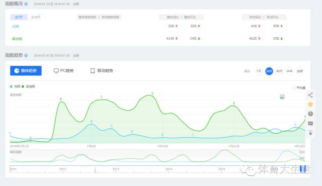 ▼刘翔(蓝线)与霍启刚(绿线)的百度指数对比,《极速前进》启播后,霍启刚人气迅速反超