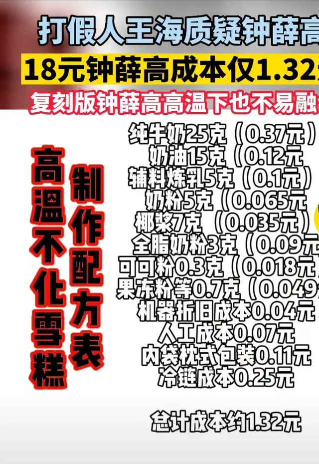 7月12日,职业打假人王海发布视频称据检测,一根18元的钟薛高实际成本为1.32元,甚至要低于前几日业内分析师推测的3-8元,一时间将钟薛高再度推向热搜。