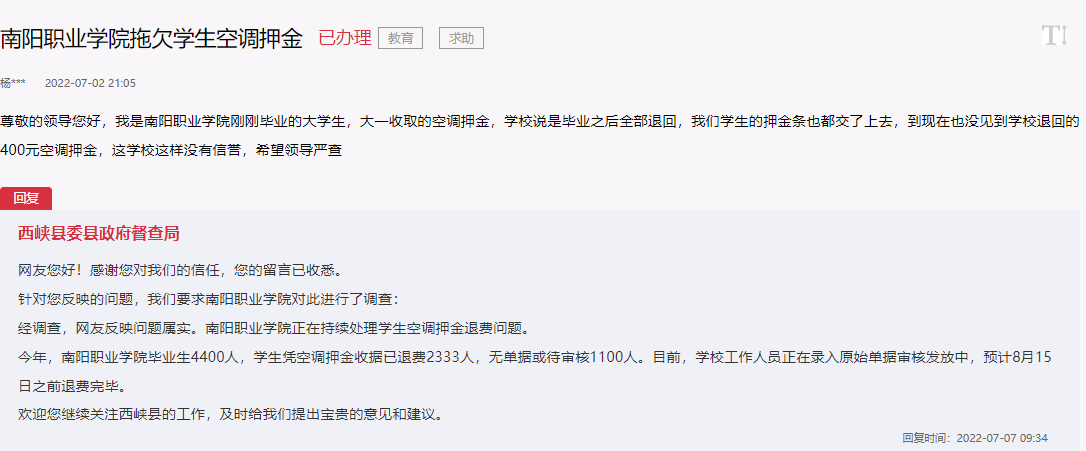 针对网友求助,西峡县委县政府督查局回复称,我们要求南阳职业学院对此进行了调查:经调查,网友反映问题属实。南阳职业学院正在持续处理学生空调押金退费问题。