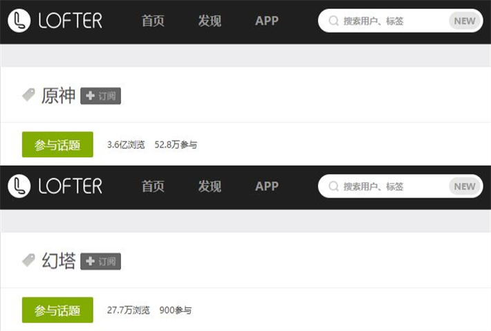 在原创社区LOFTER,#原神tag下的原创内容有52.8万参与和3.6亿浏览,#幻塔tag下则仅有900参与和27.7万浏览,二次元用户对于这两个IP“用爱发电”的原动力的差距可见一斑。