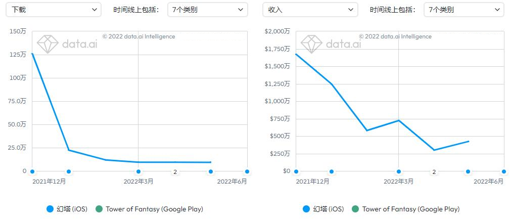 根据data.ai,从去年末上线至今,《幻塔》虽更新了多个版本,但下载与收入的总趋势下滑较为明显,目前尚无反弹迹象。由此来看,即使腾讯有“钞能力”,应该也很难凭借《幻塔》动摇《原神》的全球神话。