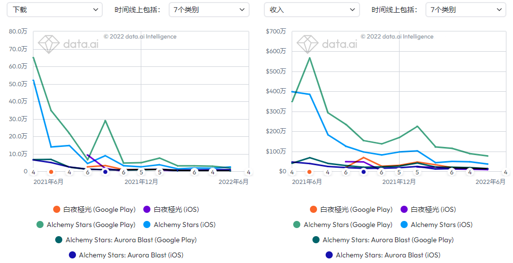 据Sensor Tower,《白夜极光》曾在去年6月一举闯入中国手游海外收入TOP30榜单,位列第23位,7月仍出现在该榜单上。而从8月开始,这款游戏的名字就从榜上消失了。data.ai显示,《白夜极光》在不同地区上线的app的下载和收入,均在公测月之后出现较快下滑,今年以来趋于稳定。