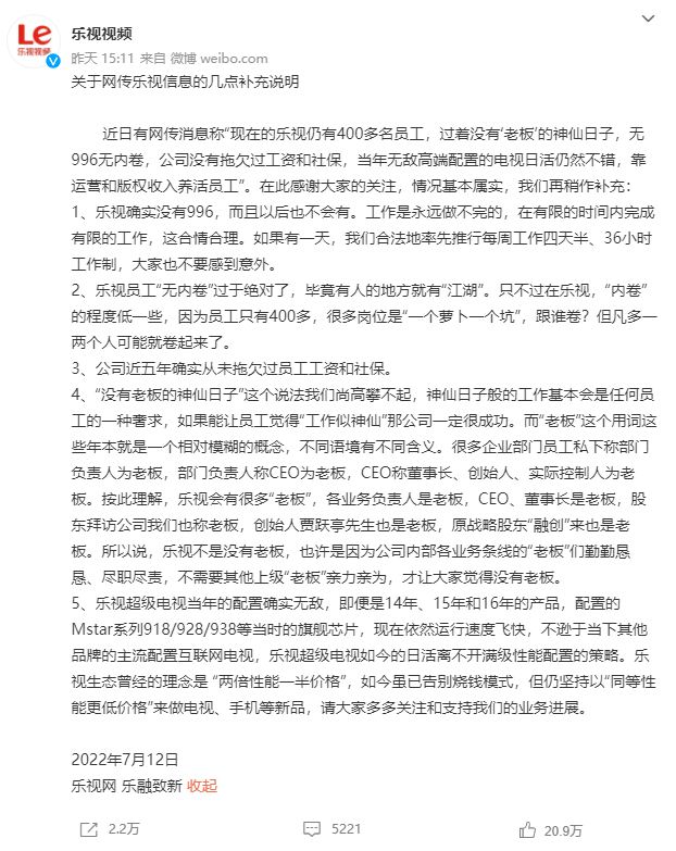 乐视官方对此也亲自下场回应称:确实没有 996,但有老板。顺带着还在声明中给自家的新老产品都做了波广告。