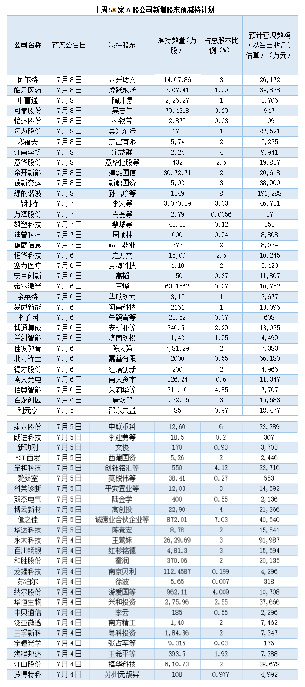 上周(7月4日至7月10日),A股公司预减持规模有所减少。据界面新闻不完全统计,共有58家A股公司披露股东减持计划。