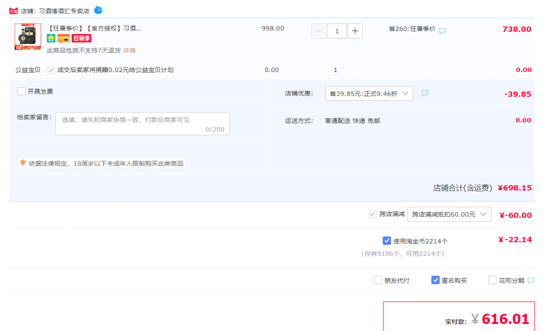 习酒窖藏1988官方旗舰店优惠前价格为868元,但实际购买价格只需要648元。在习酒的授权天猫店“习酒博酒汇专卖店”,由于可以使用淘金币,实际购买价格仅有616元。