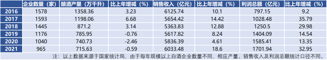 国家统计局数据显示,中国白酒产量高峰是在2016年,当年酿酒总产量达到1358.36 万千升,此后逐年下滑,2021年仅有715.63万千升,相当于五年前的一半左右。与之相对应的是,全国规模以上白酒企业从2017年最多时的1593家连续四年下降,到2021年仅剩965家。