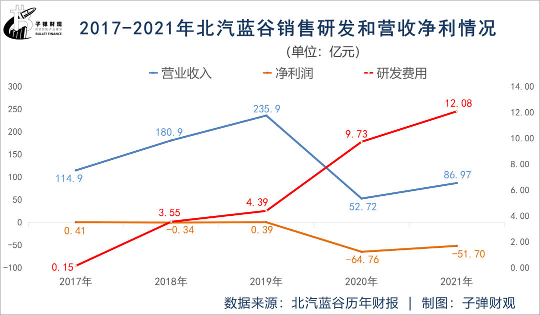 「子弹财观」整理了近五年来的营收和净利润数据发现,2020年北汽蓝谷实现营业收入52.72亿元,同比大降77.65%,净利润亏损64.76亿元,而上年还能盈利3900万元,2017年到2019年三年平均净利润更是只有1533万元。