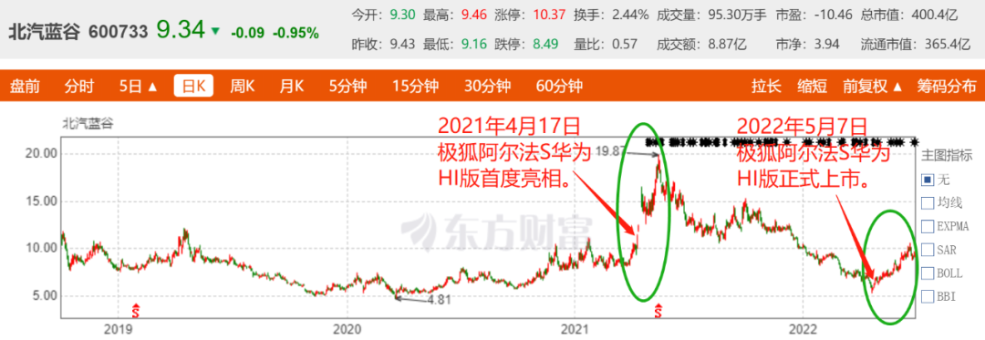 虽然没有小康那么幸运,能借华为之力直接将市值从百亿冲上千亿,但从北汽蓝谷借壳上市以来的近四年时间看,有且仅有的两次股价大涨,均因与华为合作的极狐阿尔法车型发布有关。