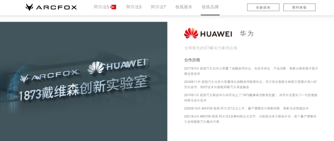 「子弹财观」注意到,在极狐汽车的官网上有关同华为的合作造车,最早可以追溯到2017年9月北汽蓝谷和华为签署的战略合作协议。随后在2019年北汽蓝谷还曾联合华为共同设立了“1873戴维森创新实验室”。