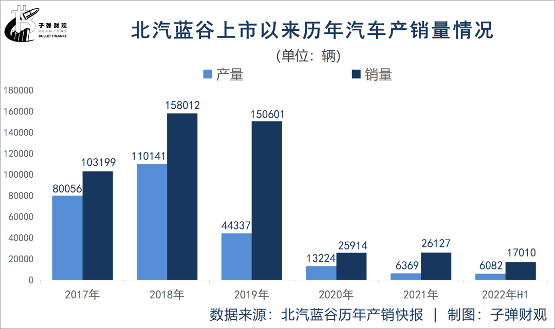 顺着产销量的结构性偏差,「子弹财观」发现在过去五年半时间里,北汽蓝谷累计完成汽车产量26.02万辆,累计实现汽车销量48.09万辆。即便是在2019年产量只有4.43万辆的情况下,北汽蓝谷依然能交出年销售15.06万辆的业绩。