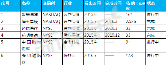 2016年3月6日,在美国纽交所上市的中国医疗器械三巨头之一的迈瑞医疗(Mindray Medical International)宣布其已经完成价值33亿美元的私有化交易。迈瑞于2006年9月在美国上市,2015年6月4日,迈瑞医疗宣布启动私有化进程。当时总裁李西廷、董事长徐航、以及首席战略官成明和三人组成的买方集团给出的收购价格是30美元。