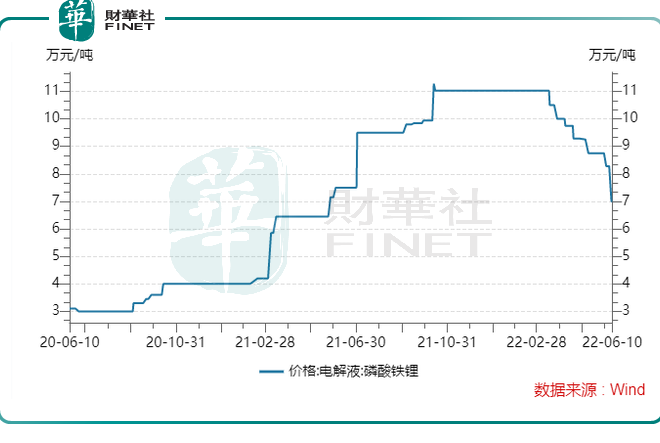 先看价格方面,相关数据显示,电解液价格自2022年3月开始向下,从11万元/吨回落至6月10日的7万元/吨,尽管有些回落,但相比2021年6月10日3万元/吨的价格依然是大幅增长的。