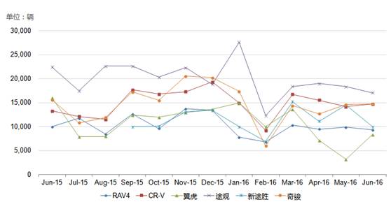 今年1-6月,一汽丰田累计销售32.32万台,去年同期销量为26.6万台,同比增加21.5%。其中卡罗拉累计销量12.8万,RAV4销量超过6万辆,同比增长15%。尽管RAV4销量还算不错,但对标东风本田CR-V,则有些尴尬了。东风本田1-6月终端销量为247128辆,同比增长42.7%。其中,CR-V销量为83173辆,同比增长21%。RAV4不仅销售基数小,增长率也落后于CR-V。同时,从上表中近一年的销售数据来看,不仅CR-V,途观、奇骏甚至新途胜都超过RAV4。