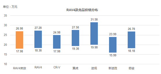 如表,RAV4荣放较老款指导价格发生了变化。RAV4荣放最低入门款价格与CR-V持平,对标意味浓厚。同时,RAV4荣放2.5高配价格也降低了3千,较奇骏2.5仅高出2千。RAV4荣放贴身肉搏的态势还是很明显的。