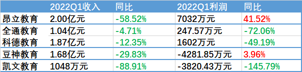 唯一净利润正向增长的昂立教育,是因为出售股份获得了投资收益,按照扣非后净利润计算,其一季度净亏损2101万元,同比由盈转亏。