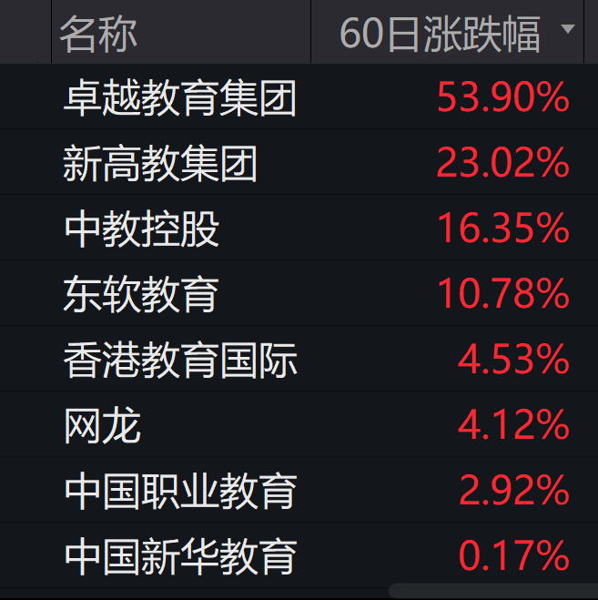 以中教控股为例,其在年报中透露,自上市起并购团队已经审视了超过500个潜在并购目标。中教控股2022年中期报告显示,截至今年2月28日,中教控股旗下拥有13所学校、30.9万名学生;报告期内实现营收23.5亿元,同比上涨28.9%。因此,大部分民办高校之后的业绩在市场人士看来还是相对有前景的;近60日内,港股教育板块中除了新东方大涨以外,新高教集团、中教控股、东软教育等民办高教公司的股价也有不同程度地回升。