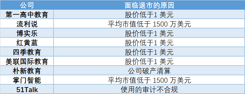 在美股,不少教育中概股被警告股价或市值不合规。第一高中教育、流利说、博实乐、四季教育、红黄蓝、美联、掌门智能等公司均因股价低、市值低等原因被交易所责令退市。