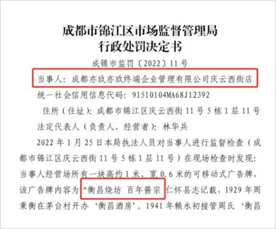 然而,“碰瓷茅台”的招数也有翻车的时候。日前,衡昌烧坊因涉嫌虚假宣传被成都市监局点名批评,连带卖酒的门店都被罚了60万。