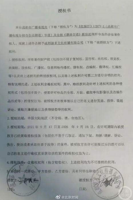 授权书中表示,成都市广播电视台是《谭谈交通》这档节目的合法著作权人,并且电视台将这档节目的所有著作财产权授权给游术文化这家公司。