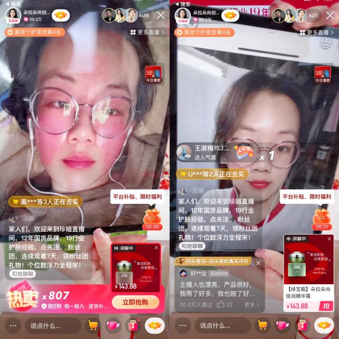 朵拉朵尚的李海珍在直播时,与其他达人进行“连麦PK”。一款原价198的眼霜,在对面一声声的“姐姐,给我们老铁放个福利吧”之下,最后的上架价格变成 了 158.99元3盒。