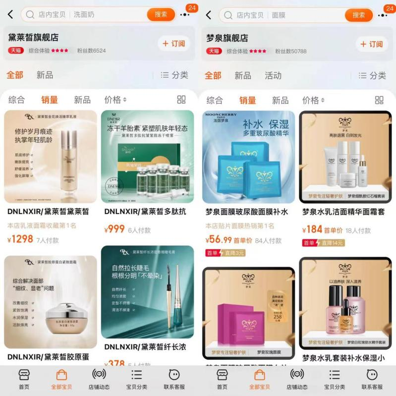 以天猫旗舰店为例,黛莱皙最高的一款乳液月销仅为7瓶,梦泉销量最高的补水面膜月销也仅为84盒。