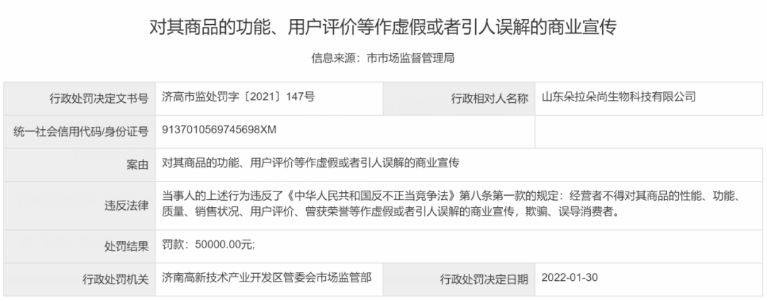 随后,相关政府以当事人的行为违反了《中华人民共和国反不正当竞争法》第八条第一款的规定,对朵拉朵尚公司对其商品的功能、用户评价等作虚假或者引人误解商业宣传的违法行为作出罚款5万元的行政处罚。