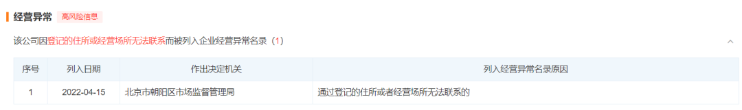 与此同时,在天眼查中显示,梦泉时尚(北京)贸易有限公司在今年4月15日,被北京市朝阳区市场监督管理局列入经营异常名录,原因为通过登记的住所或者经营场所无法联系。