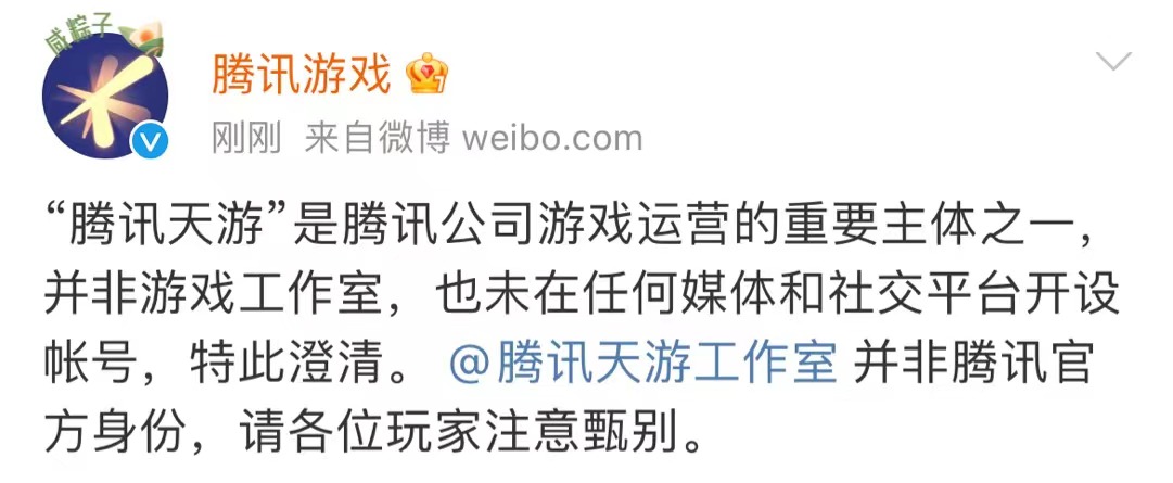 7月14日,@腾讯游戏 发文称,“腾讯天游”是腾讯公司游戏运营的重要主体之一,并非游戏工作室,也未在任何媒体和社交平台开设帐号,特此澄清。 @腾讯天游工作室 并非腾讯官方身份,请各位玩家注意甄别。