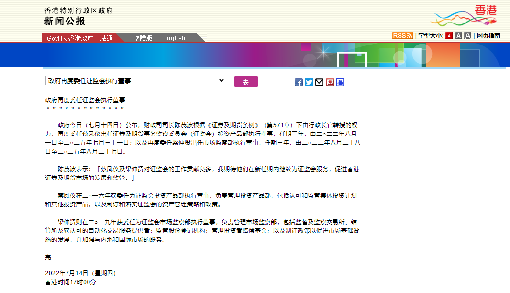据香港特区政府7月14日新闻公报,香港特区政府今日(7月14日)公布,香港特区财政司司长陈茂波根据《证券及期货条例》(第571章)下由行政长官转授的权力,再度委任蔡凤仪出任证券及期货事务监察委员会(证监会)投资产品部执行董事,任期3年,由2022年8月1日至2025年7月31日;以及再度委任梁仲贤出任市场监察部执行董事,任期3年,由2022年8月28日至2025年8月27日。