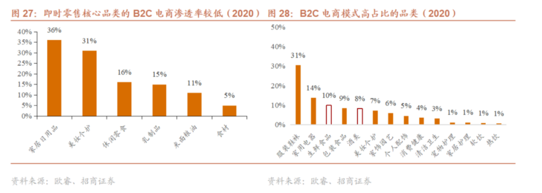 而在日常消费中,消费者的即时性需求往往产生在一些“非标品”“难以囤货”或“高频消耗”等商品上。因此,即时零售和传统电商的主营商品也不同:前者是与消费者日常相关的生鲜食杂类商品,后者则是以计划性需求和易于异地长途运输的标品为主,如服装、图书、3C数码等。