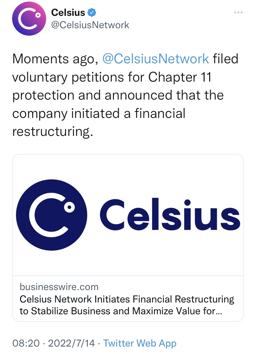 美东时间7月13日,全球最大加密借贷平台之一的Celsius Network宣布,已在纽约南区美国破产法院根据破产法第11章申请破产。