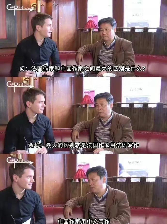 这不禁叫人想起法国记者问余华,法国作家和中国作家最大区别是什么。余华用严肃但是快要笑出来的表情回答:“最大的区别就是法国作家用法语写作,中国作家用中文写作。”