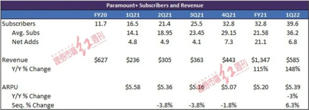 从附表我们可以看到,在2020年底订阅流媒体平台Paramount+只有1170万订阅者,但到了2022年的一季度,已经接近4000万人;2020年全年订阅流媒体营收6.27亿美元,2021年增长了115%达到13.5亿美元,而2022年1季度营收同比增长幅度竟增加了148%。