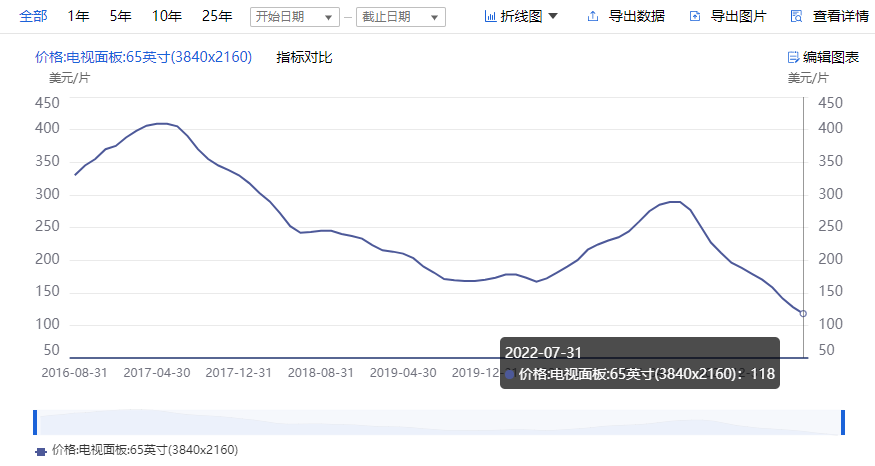 大尺寸领域,面板价格自去年下半年以来持续下滑。以65英寸面板价格为例,最新价格为118美元/片,已达到近五年的新低。