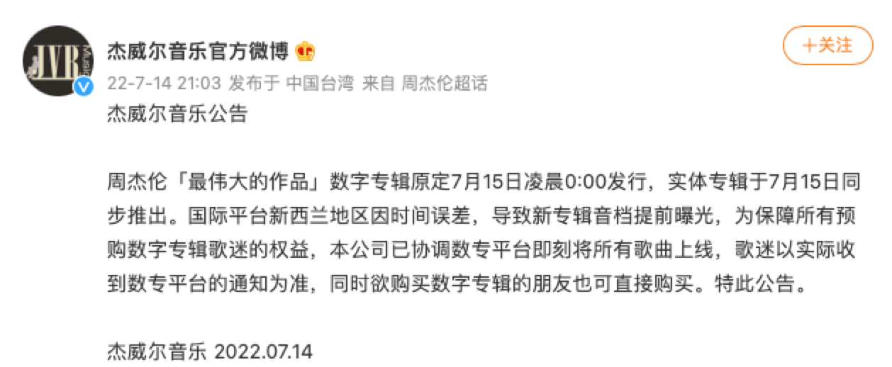 7月14日,@杰威尔音乐官方微博 发文称,周杰伦“最伟大的作品”数字专辑原定7月15日凌晨0:00发行,实体专辑于7月15日同步推出。国际平台新西兰地区因时间误差,导致新专辑音档提前曝光,为保障所有预购数字专辑歌迷的权益,公司已协调数专平台即刻将所有歌曲上线,歌迷以实际收到数专平台的通知为准,同时欲购买数字专辑的朋友也可直接购买。