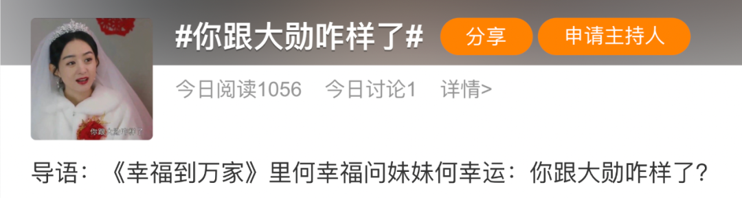 看到 #你跟大勋咋样了# 这词条,咱就是说但凡关心点娱乐圈的人,都以为这是某W姓男星和某Y姓女星的八卦梗吧,点开一看倒好,敢情这只是热播剧《幸福到万家》里一句无关痛痒的台词衍生的话题。