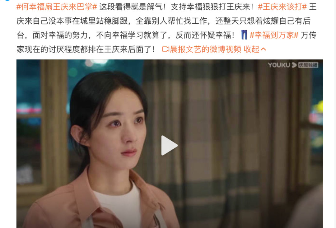 就拿近期热播的《幸福到万家》来说,每日不重样的话题几乎“赖”在热搜上不走。前天观众们还操心着 #给王庆来找活干# ,昨天网友们就开始焦虑 #何幸福跟王庆来什么时候离婚# ,今天群众们就能为了 #何幸福扇王庆来巴掌# 的解气片段振臂欢呼。