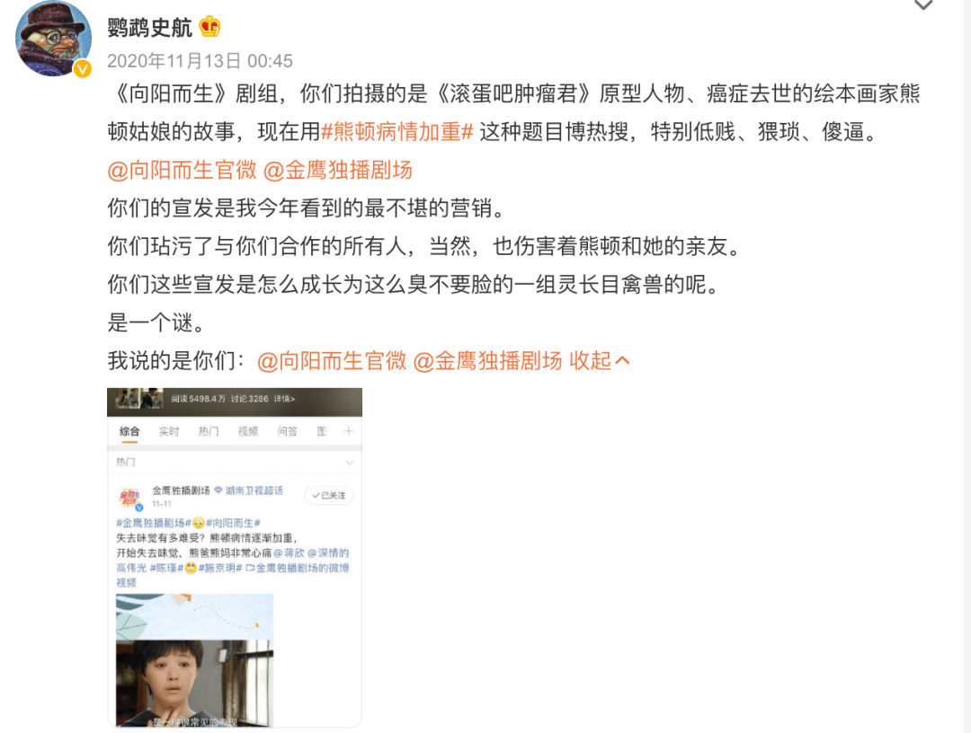 剧方都明白,有人骂就代表有热度,就是成功,但市场上不是没出现过被黑红话题带崩盘的项目。比如两年前有部剧《向阳而生》,因为用 #熊顿病情加重# 的话题碰瓷与主角同名的已逝作家熊顿,直接拉崩了路人盘(网友普遍认为此举不尊重逝者),剧方后续做再多补救动作也没能挽回口碑。