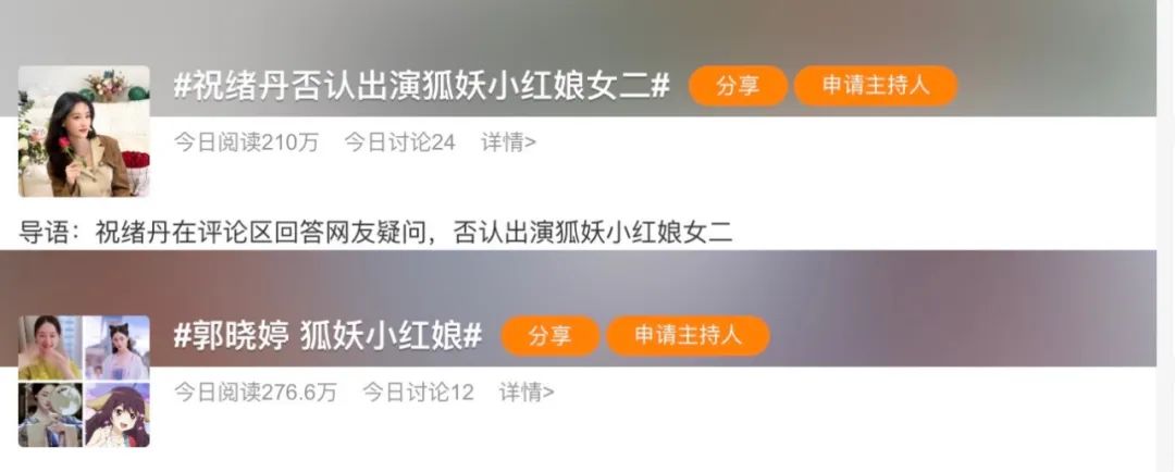 其中《狐妖小红娘》可谓预热营销“典范”。杨幂录制别家综艺受伤,该剧马上蹭了个 #制作人否认杨幂推掉狐妖小红娘# 的热搜。围绕该剧“女二”是谁的悬念,剧方故意掖着让网友瞎猜,一会 #祝绪丹否认出演狐妖小红娘女二# ,一会 #郭晓婷 狐妖小红娘# 上了热搜第二,这波勾得各家小花粉丝暗自较劲的打法,真是拿捏住了内娱流量密码。