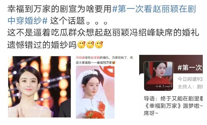 还有种蹭法,笔者愿将其称之为“疯狗蹭”,招式要点就是不计后果地硬蹭。《幸福到万家》的 #你跟大勋咋样了# 显然可归于此类,成功煽动了对家粉丝们的饭圈拉踩。该剧同期还拟过一个 #第一次看赵丽颖在剧中穿婚纱# 的词条,这不是逼着吃瓜群众想起赵丽颖和冯绍峰缺席的婚纱和婚礼嘛。