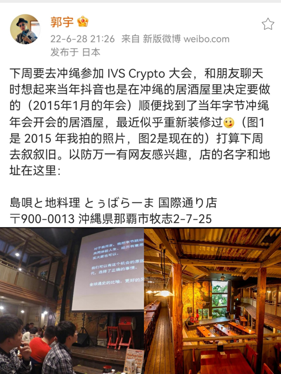 28岁从字节跳动退休,旅居日本的郭宇现已投身在Web3的浪潮中。最近去参加冲绳的IVS Crypto大会时,郭宇想起当年一群人决定做字节的时候,也是在冲绳的一家居酒屋。当年那一屋子穿格子衬衫和保暖内衣、一起看PPT的人如今都已身价不菲,而新的时代新的机遇又再一次向互联网人招手。