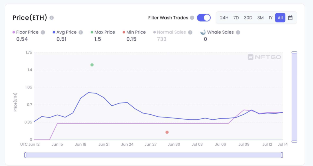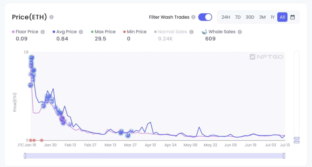 例如今年1月,国民级表情包“冷兔宝宝”发行NFT,上线当日仅半天价格就翻了23倍。虽然据该项目官网的路线图为项目制定了长远的计划,通过与链游合作、品牌联名等方式维持NFT的长期价值,但用户似乎并不买账,目前该项目的NFT平均价格已从1.39以太币跌至0.09以太币,地板价也为0.09以太币。