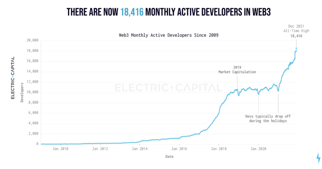 据Electric Capital发布报告显示,相比2020年12月,2021年全球研究开源加密货币和Web3项目的月活开发人员超过1.8万人,增长了195%,数量达到史无前例的水平。并且,加入以太坊生态的Web3开发者中65%都是2021年进入的。