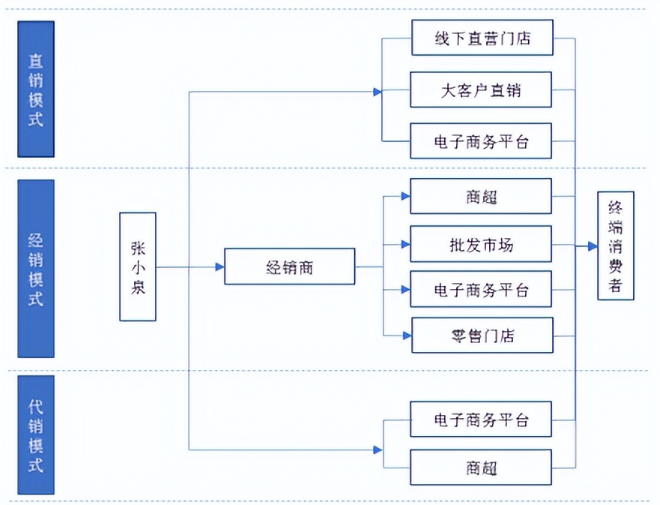 首先来看,张小泉的销售模式,其生产的大部分刀、剪都是直接出售给各大经销商,经销商再通过各自的渠道,销售给下游的商超、零售门店以及消费者。