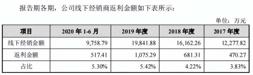 值得一提的是,张小泉的经销模式一直伴随着高昂的返利。据其招股书显示,2020年上半年,张小泉经销返利金额达到517万元,占经销金额的比例为5.3%,且呈现逐年上升的态势。