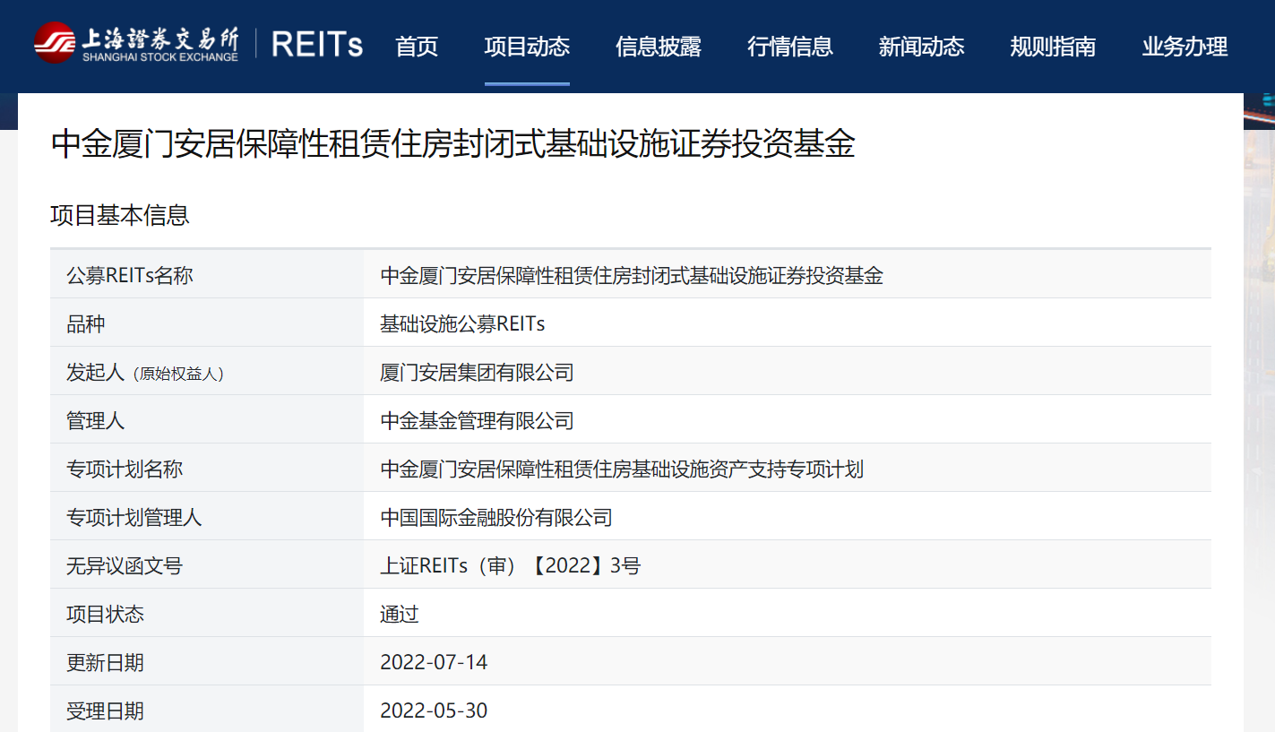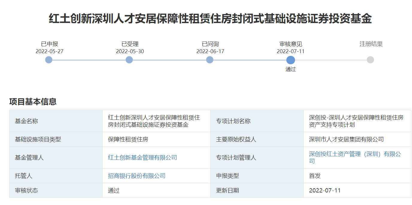 7月14日,上交所网站信息显示,中金厦门安居保障性租赁住房封闭式基础设施证券投资基金项目已获上交所审核通过。而在此前的7月11日, 红土创新深圳人才安居保障性租赁住房封闭式基础设施证券投资基金项目也已经获深交所通过。