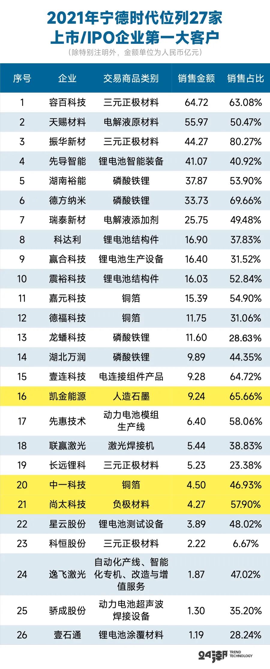 具体到企业层面,2021年宁德时代位列其中26家企业的第一大客户,11家企业对宁德时代的销售占比在50%以上,最高者更是高达80.27%。(注:数据来自于券商研报、上市公司公告等,黄色标注部分是企业招股书披露2021年上半年数据)